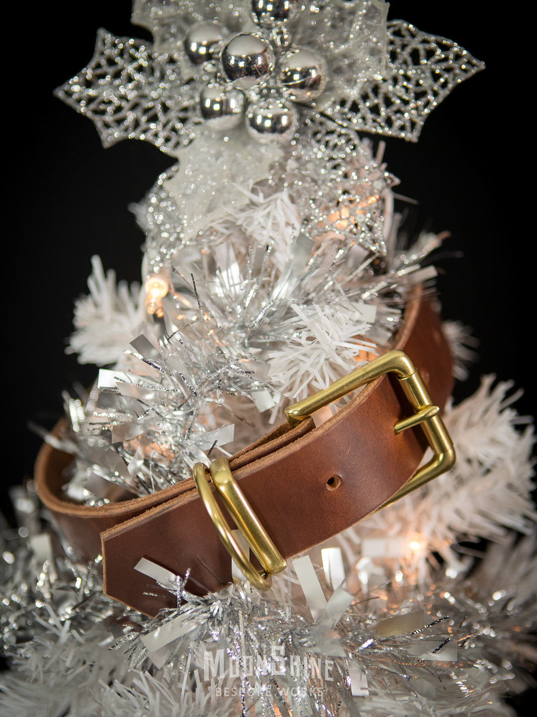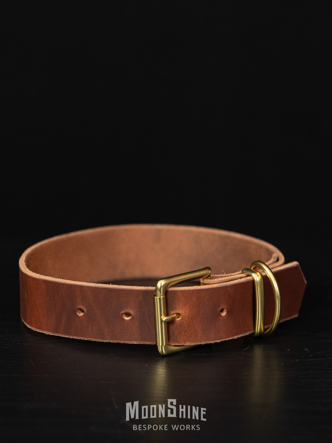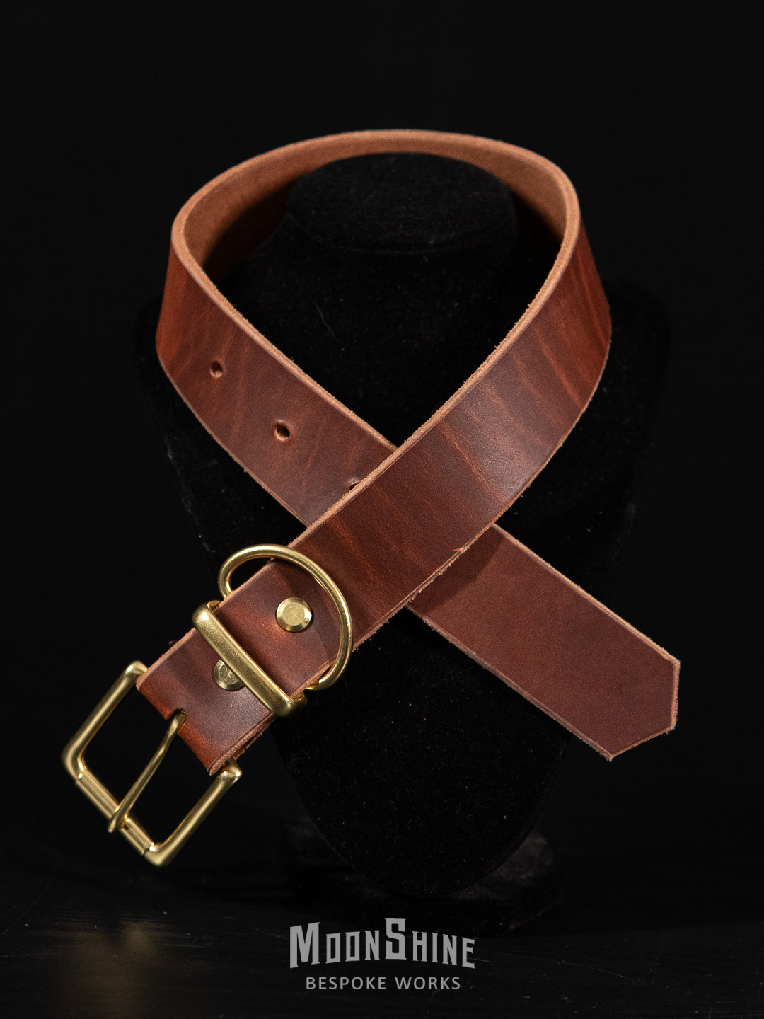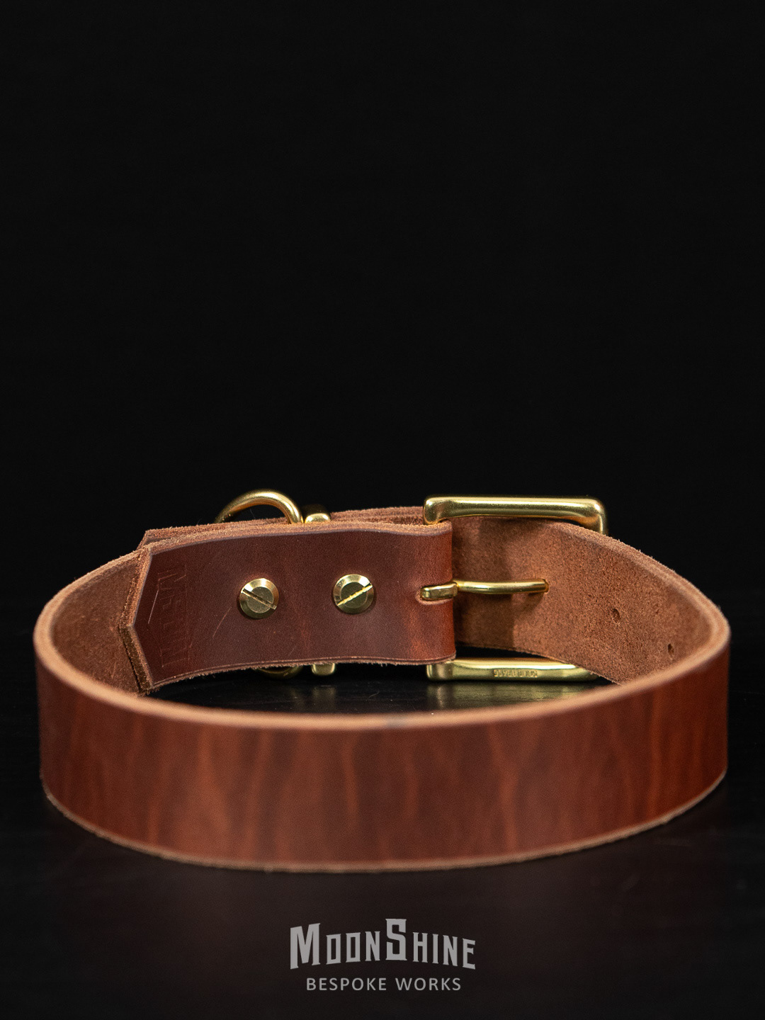 This 1.5" wide handmade leather dog collar is crafted from Hermann Oak Racetrack leather, a dense, vegetable-tanned leather made in the USA and trusted for its strength, longevity, and ability to age beautifully over time.
