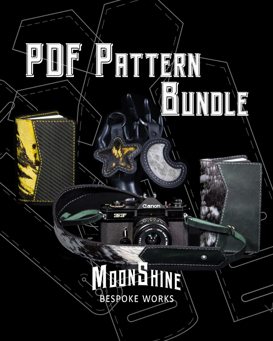 The entire January Pattern of the Month Collection in one place! PDF Patterns ready to help you make your own Camera Strap, Field Notes Journal Cover and Passport Cover (in both Chevron and Coffin designs), and the Star and Moon Inlay Bag Charms/Keychains. Only available as a bundle until the end of the month at ~25% off over buying each pattern individually, and then it's gone!