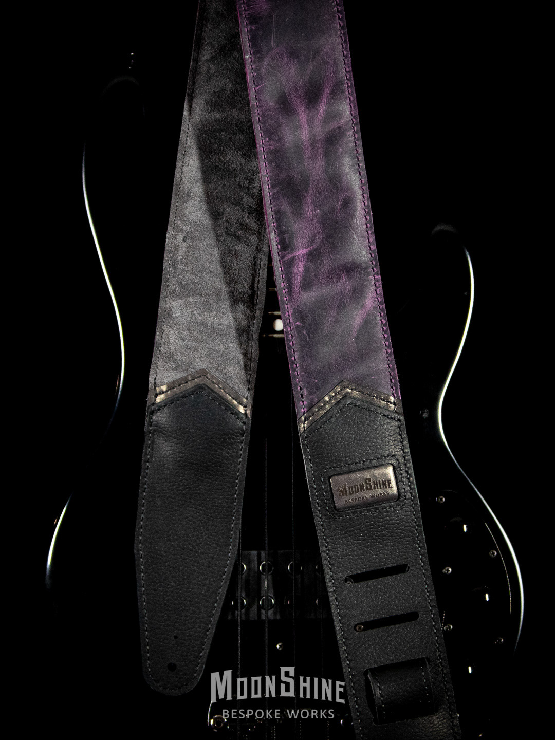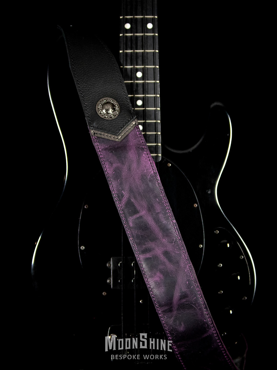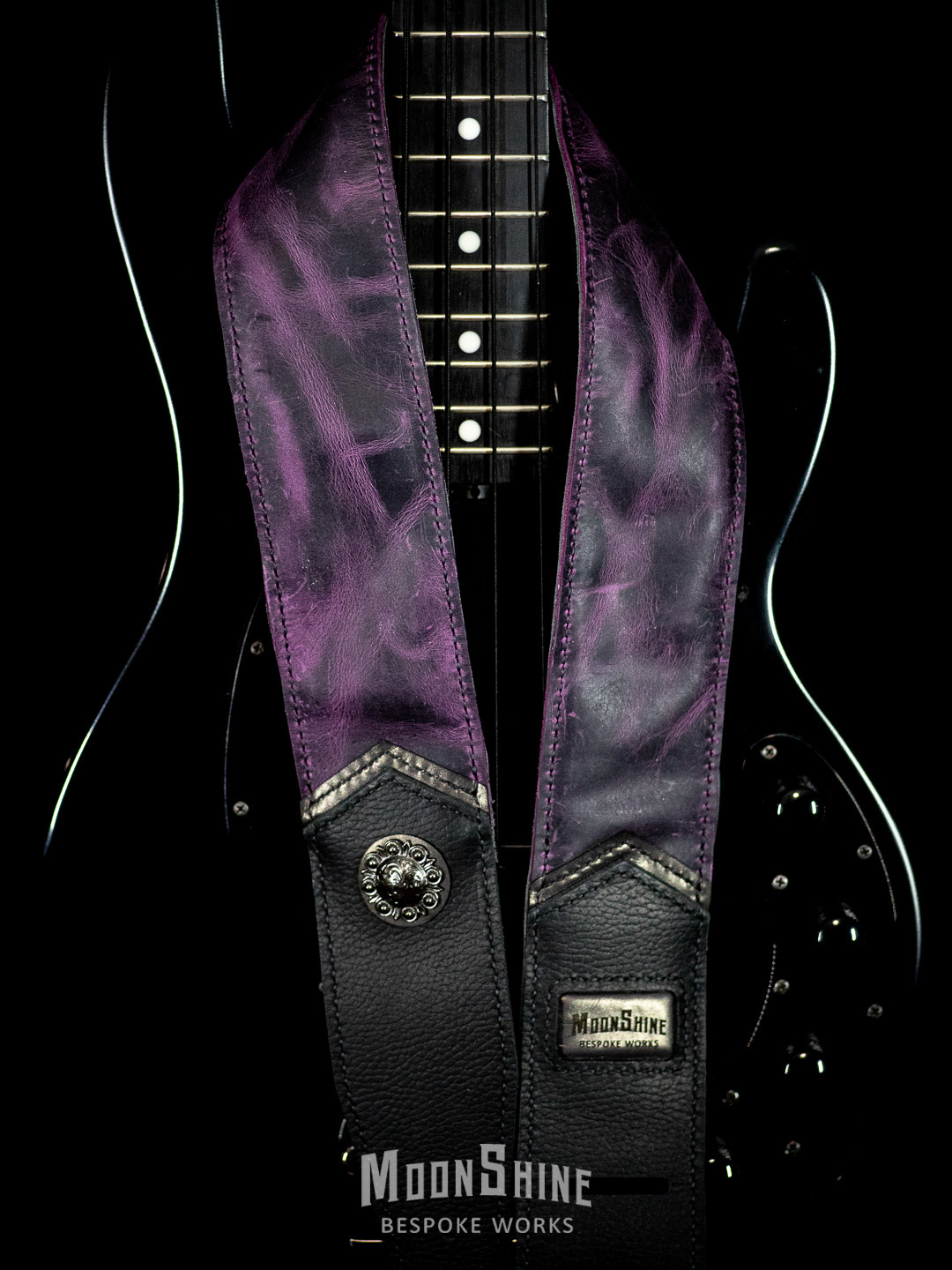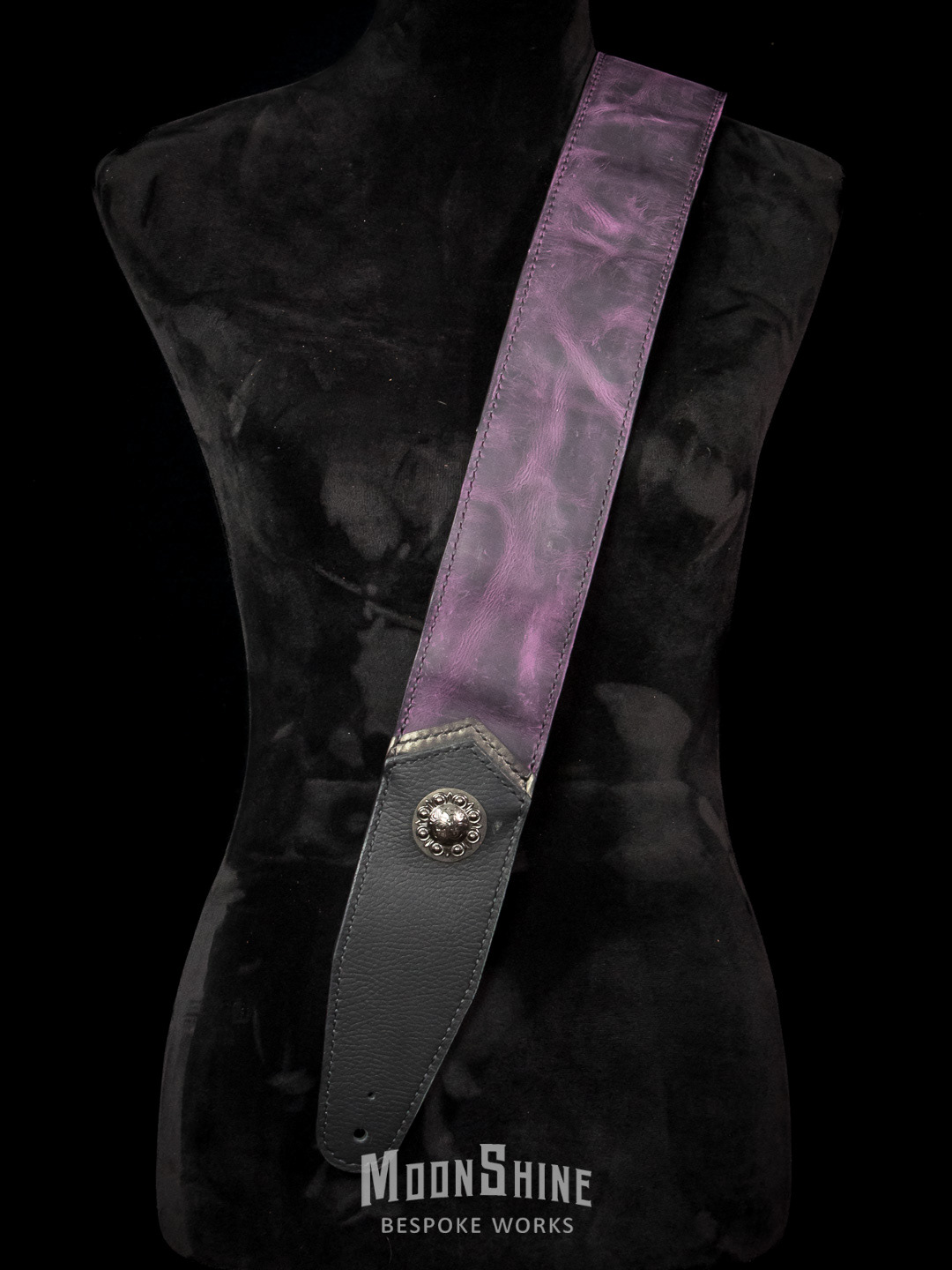 The strap features a rich, oil-tan purple leather body with a natural pull-up effect that develops character with use, paired with matte pebbled black leather at the head and tail for durability and contrast. Subtle gunmetal metallic accents add depth without overpowering the design, while a solid concho provides a restrained focal point.