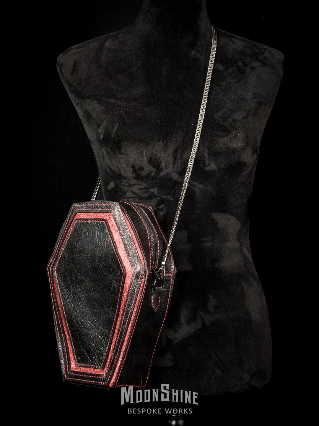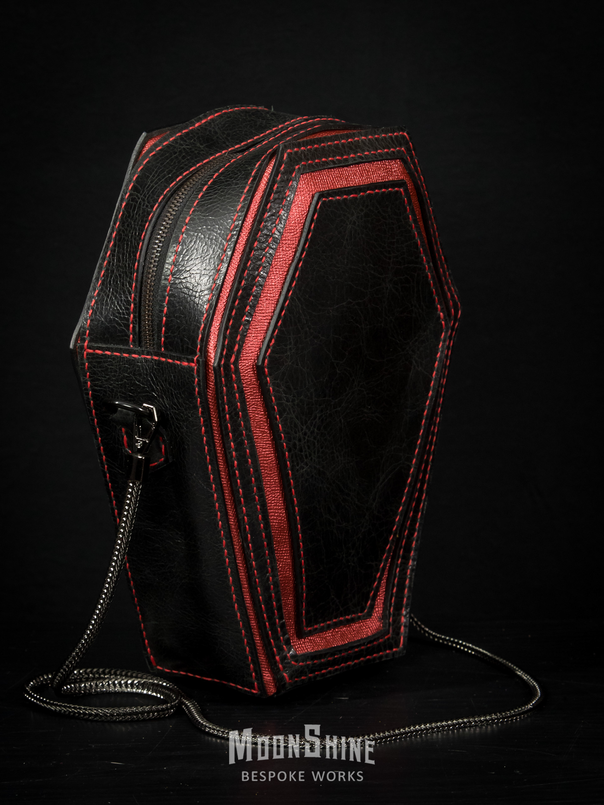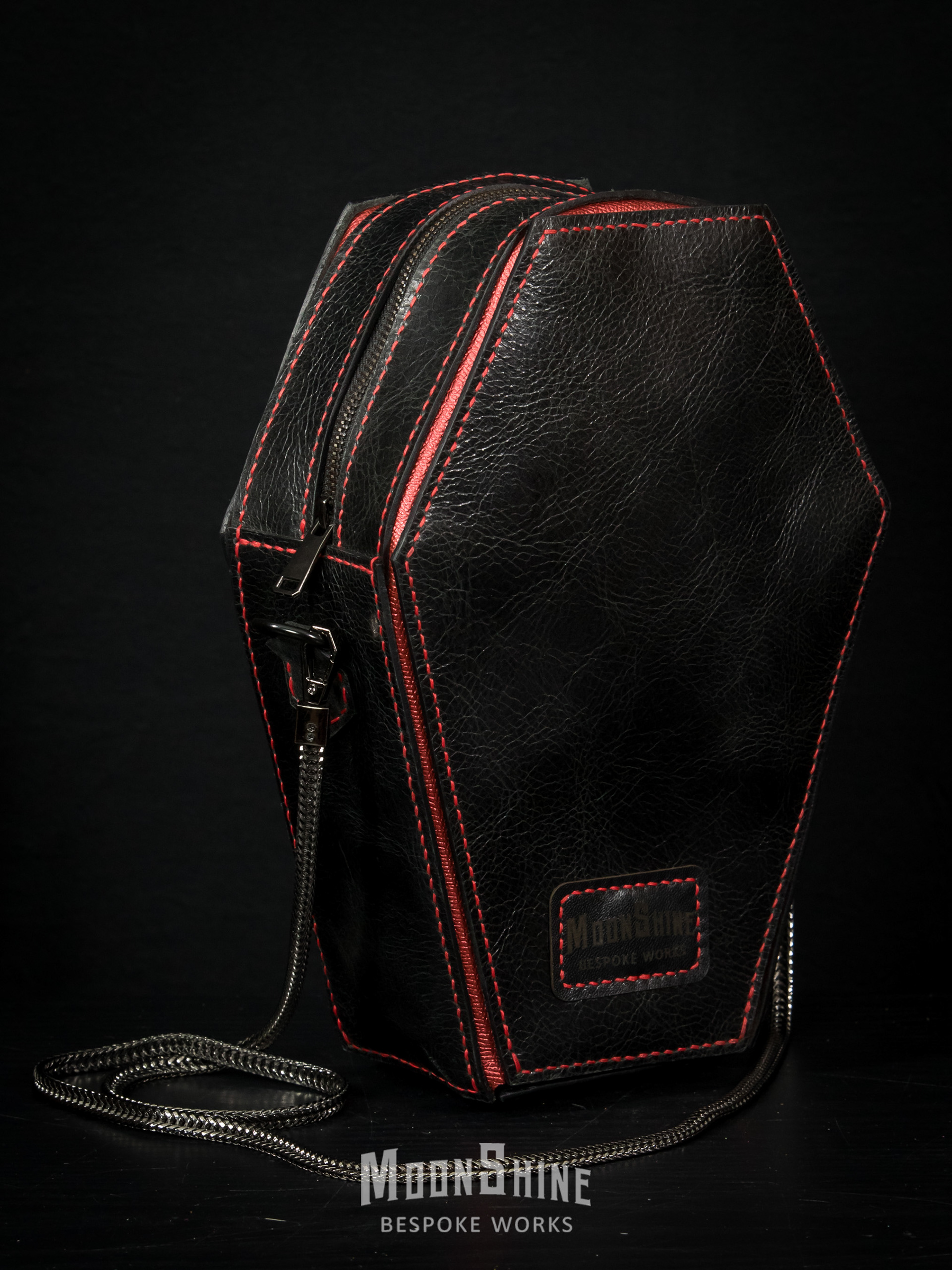Embrace spooky vibes year-round with this unique handmade coffin bag! Crafted with meticulous attention to detail, this bag is perfect for those who love to stand out with a touch of gothic flair.